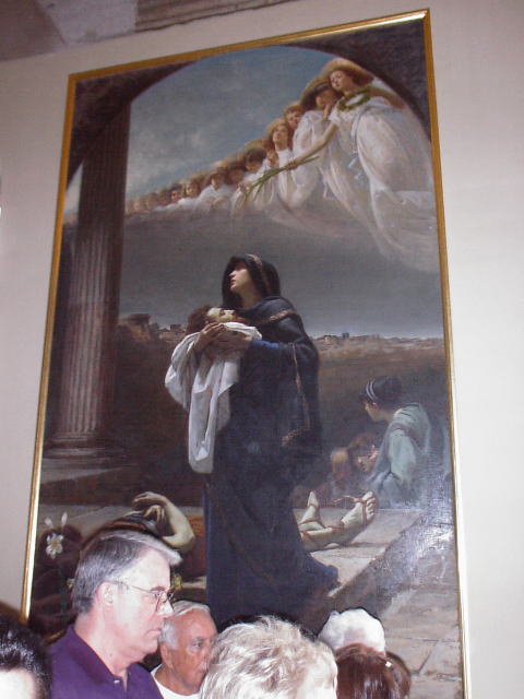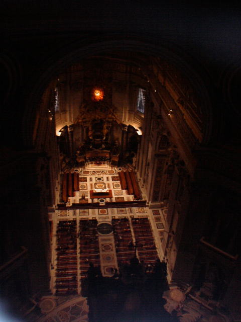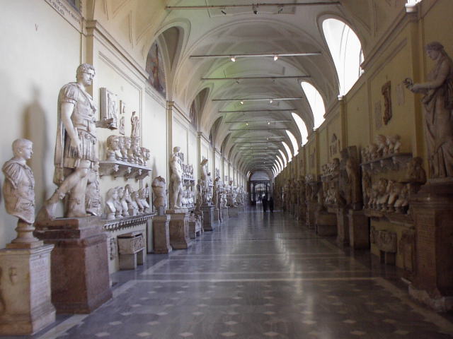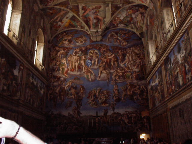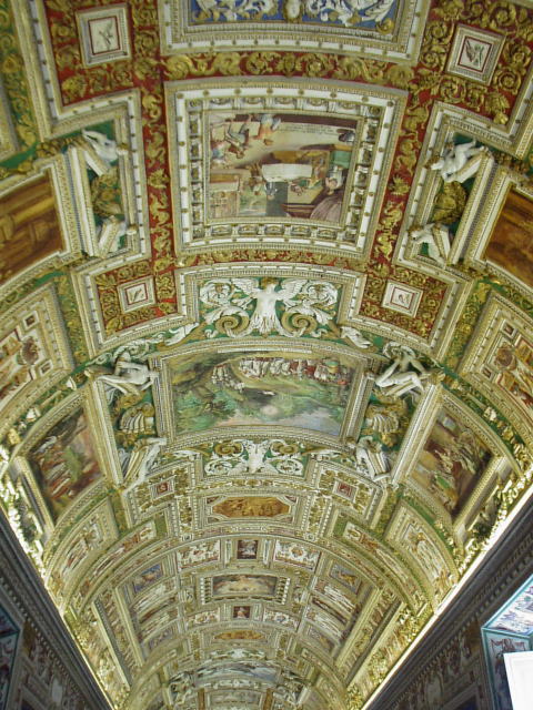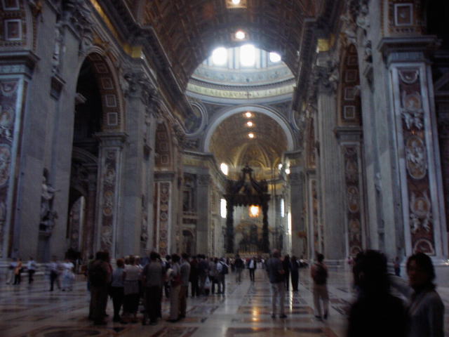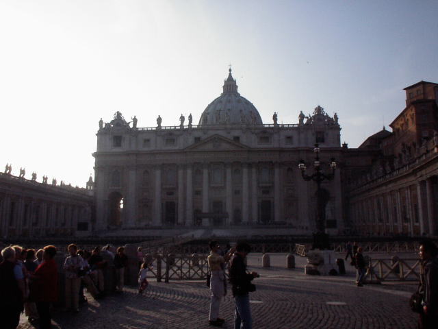 2日目(11月5日) 朝起きるといきなり風邪・・・。 かなりしんどい状況の中、ローマ観光へ向かいました。 今日は、見るのに時間がかなりかかると思われるヴァチカン市国へ行くことにしました。 ここを抑えとけば、とりあえずOKかなと思ったので。 ここで、簡単にヴァチカン市国というものを説明します。 ヴァチカンとは、イタリアではなく独立国家みたいです。 しかし、特にパスポートチェックなどはありません。 ローマ法王の直轄地でカトリックの総本山ということらしいのですが、詳しいことは良くわかりません。 興味がある方は、世界史を勉強してください。 ヴァチカン市国へは、普通に地下鉄で行けるのですが、どこからがヴァチカンなのか良くわかりませんでした。ヴァチカン市国には、世界有数のヴァチカン宮殿がありますので、そこからスタートすることにしました。 到着すると、いきなりの大行列!何かというと入場待ちをしている観光客の列でした。 仕方がないので側壁に沿って同じように並んで待つこと1時間、ようやく中へ入ることができました。 ![]() 宮殿はとても大きく、本気で見るとなると1週間はかかると言われています。 宮殿の中には20もの博物館、美術館、絵画館、図書館があって、どこがどこだかわからないというのが本音です。 中へ入ると一本道があり、両サイドにたくさんの銅像があります。 その先にもたくさんの銅像や海外があり、建物の天井などもとても綺麗です。 イタリアの美術館は、基本的に写真はNGなのですが、このヴァチカン宮殿は、写真を撮ることができるので、ちょっとだけですが、みなさんにお見せすることができます。 美術などの芸術作品や西洋史が好きな方には、たまらない場所だと思います。 その中で、ここだけは外せないという場所が、システィーナ礼拝堂です。 ここは、宮殿の一番裏にあり、ミケランジェロの「最後の審判」がある場所です。ここだけは、さすがに写真撮影禁止でしたが、みんながバシバシ撮っていたので、便乗して写真を撮ってしまいました。 この絵は、中央にマリアと聖人を従えたキリストがいて、審判をくだしているみたいです。 そして、右側にいる人たちは、選らばれし者として天へ登って行き、左側にいる人たちは、駄目ということで地獄へ落ちるということを意味しているみたいです。 ちなみに、キリストの足元に書かれている人間の顔は、ミケランジェロの自画像と言われていて、とてもグロテスクに書かれているそうです。 もう一つ外せないという場所が、ラファエッロの間です。ラファエッロの間は、宮殿の右端にあり、ラファエッロと弟子たちによって完成された部屋です。 ここは、4つの部屋からなっていて、各部屋にそれぞれ有名な絵画が飾られています。 1つ目の部屋が火災の間。2つ目が署名の間。3つ目がヘリオドロスの間。4つ目がコンスタンティヌスの間らしいのですが、どれがどの部屋か良くわかりませんでした。 たぶん、このラファエッロの間で撮った写真はこちら(←)です。 すごいと感動しつつも同じようなものばかり見て疲れてしまった私たちは、ヴァチカン宮殿を出ることにしました。 時計を見るとすでに15時くらい。結局、4時間くらい中にいました。 外に出ると急におなかがすいてきました。 それもそのはず、私たちは、朝食のパン以外は何も食べてなかったのです。 そこで、思いつくものは、やっぱりピッツァ! 近くにピッツァセットがあるレストランがあったので、そこでイタリア最初のイタリア料理を食べました。 ピッツァは、トマトソースがメインのノーマルなピッツァで、特においしいとは思いませんでした。 量は、かなりのものでしたけど。 ゆっくりと遅い昼食をとった後、サン・ピエトロ広場へ行きました。 サン・ピエトロというのは、聖人ペテロのことで、この広場あたりで逆十字架に架けられたことから、サン・ピエトロ広場というそうです。周りは、神殿のように大きな柱がたくさん並んでいて、とても雄大でお勧めの場所です。 サン・ピエトロ広場を満足してから、目の前にあるサン・ピエトロ寺院へ行きました。 ここは、カトリックの総本山で、神秘的な雰囲気がある建物です。 中は神聖の場所だけあってとても静かであり、絵画や彫刻などがたくさんあります。 中だけでも、とても満足できるのですが、この寺院にはクーポラという屋上があります。 そこで、とりあえず上ってみようとクーポラの入り口を探すことにしました。余談ですが、イタリアの寺院には、どこでもクーポラというものがあります。 今後もいくつかのクーポラの話が出てきますが、そのうちの一つが、あの冷静と情熱の間に出てきたクーポラです。 話は戻って、クーポラの入り口ですが、中を3回くらいぐるぐる回ってみたのですが全然見つかりません・・・。 ガイドブックの地図を開いてみたのですが、そこにはプレイ(祈り)ルームしかありませんでした。 もしかしたら、このプレイ